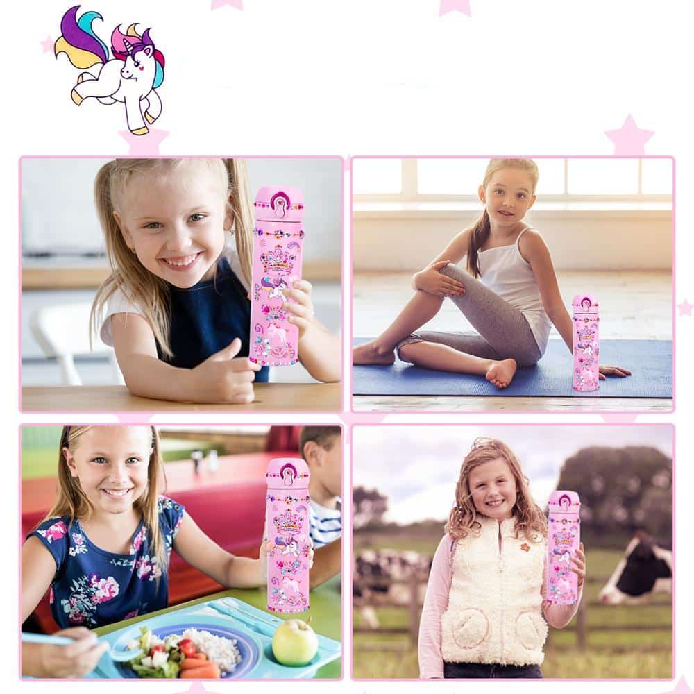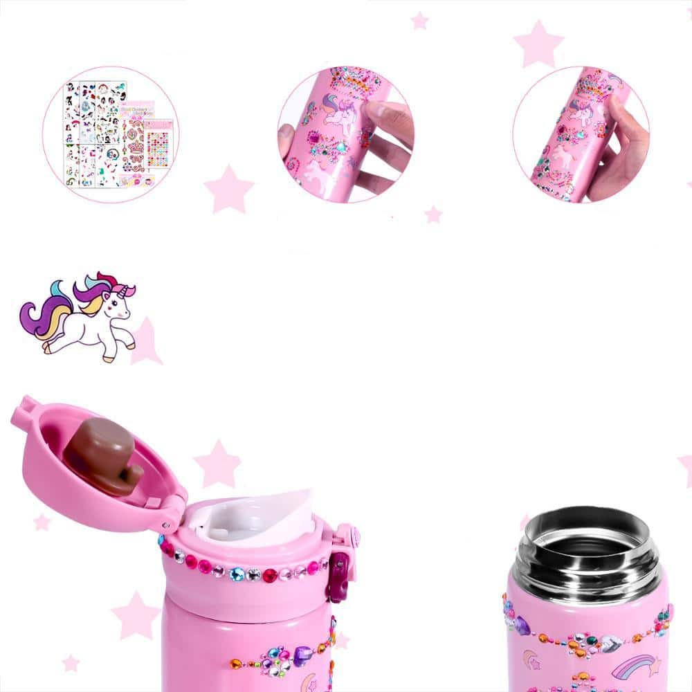 Op zoek naar een waterfles voor meisjes die zowel in de zomer als in de winter gebruikt kan worden? Kies dan voor deze schattige geïsoleerde waterfles met eenhoornsticker. Hij is roze, schattig en glinsterend. Uw dochter zal dol zijn op het vrouwelijke ontwerp. Deze isothermische kinderfles houdt drankjes warm of koel.