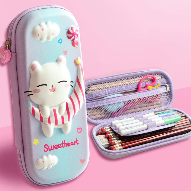 Hier is een prachtige harde etui voor uw kinderen. Hij gaat in het midden open met een rits. Binnenin zitten vakjes voor pennen en stiften. Het kattenmotief op het deksel is in reliëf aangebracht, en het etui is spatwaterdicht.
