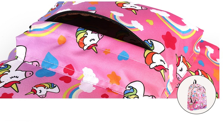 Een schoolrugzak met verschillende eenhoorn- en regenboogmotieven. Neem uw kinderen mee in de magische wereld van de eenhoorns met dit praktische pakket. Een school- of reistas met veel vakken en opbergmogelijkheden zoals op de foto\’s kunt zien.