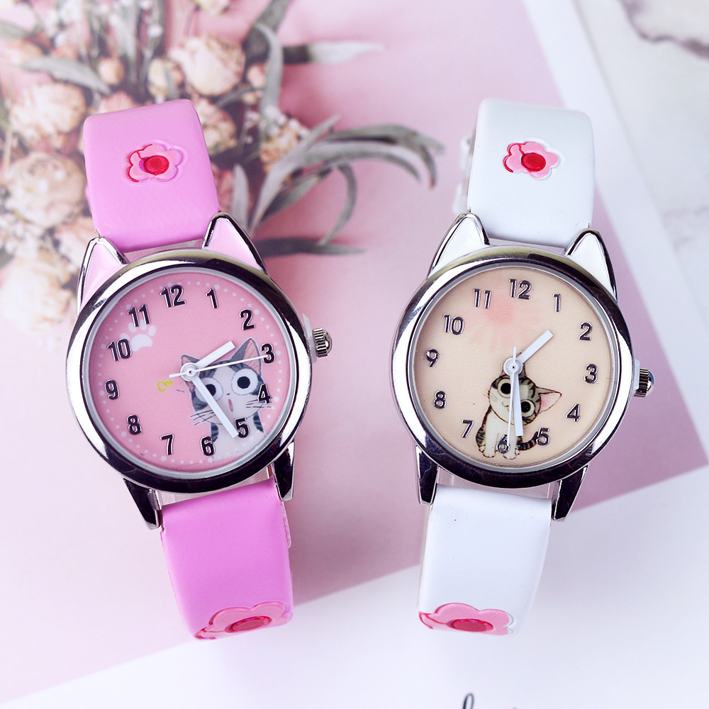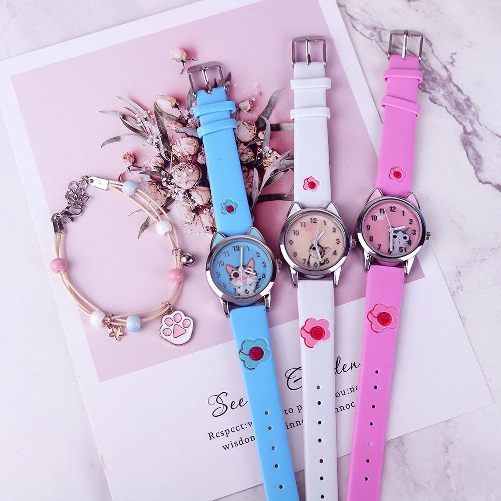 Het meisjeshorloge met gekleurde band en wijzerplaat met kleine kat is een leuk, speels modeaccessoire dat alle kleine meisjes zal aanspreken. Dit horloge heeft een comfortabel leren bandje, verkrijgbaar in verschillende felle, levendige kleuren die bij elke stijl passen.