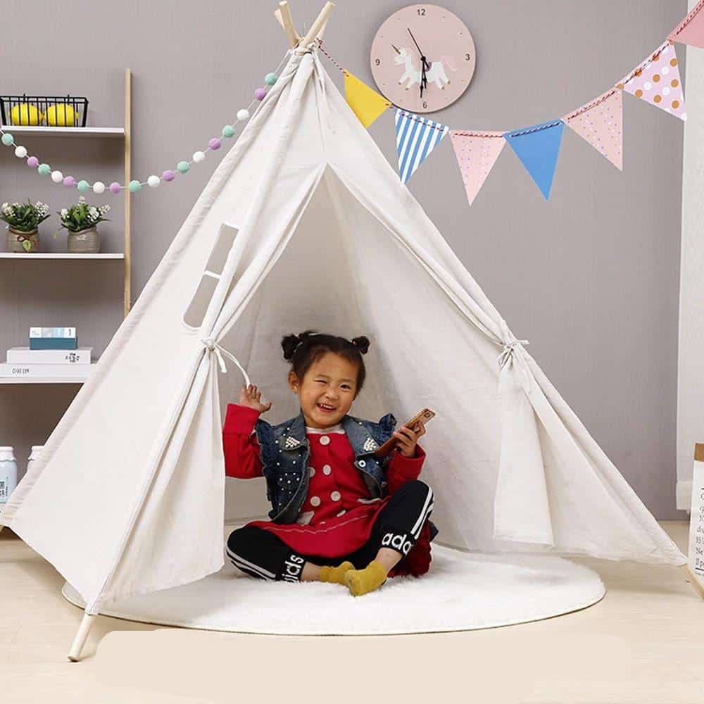 Echte kindertipi met 4 houten palen die gemakkelijk gedemonteerd kunnen worden voor transport. Gemaakt van duurzaam katoenen canvas van hoge kwaliteit, met een raam aan de zijkant voor gemakkelijke inspectie door kinderen.