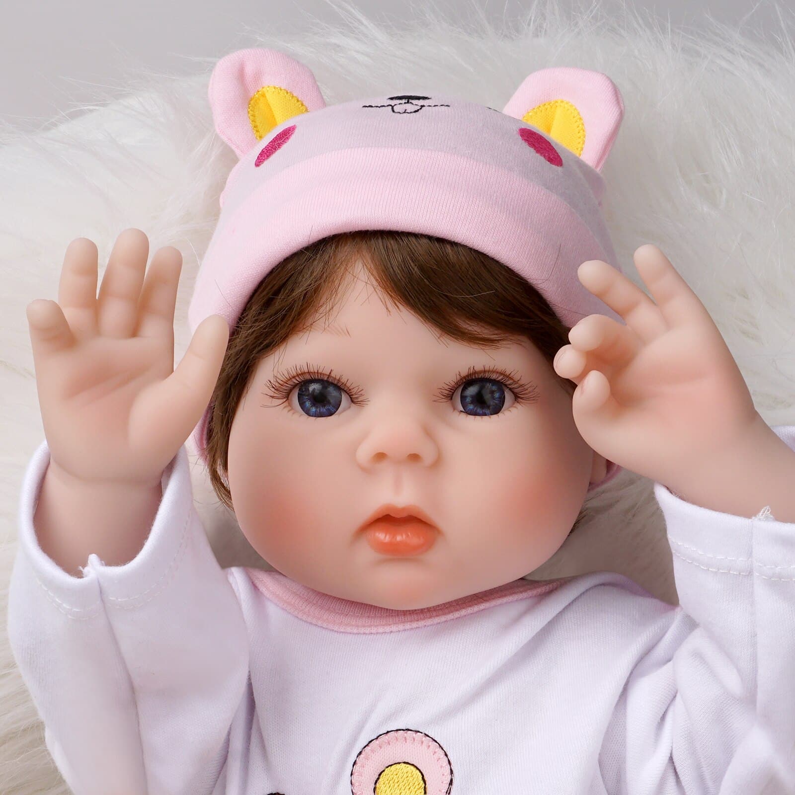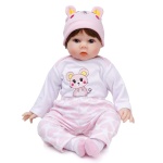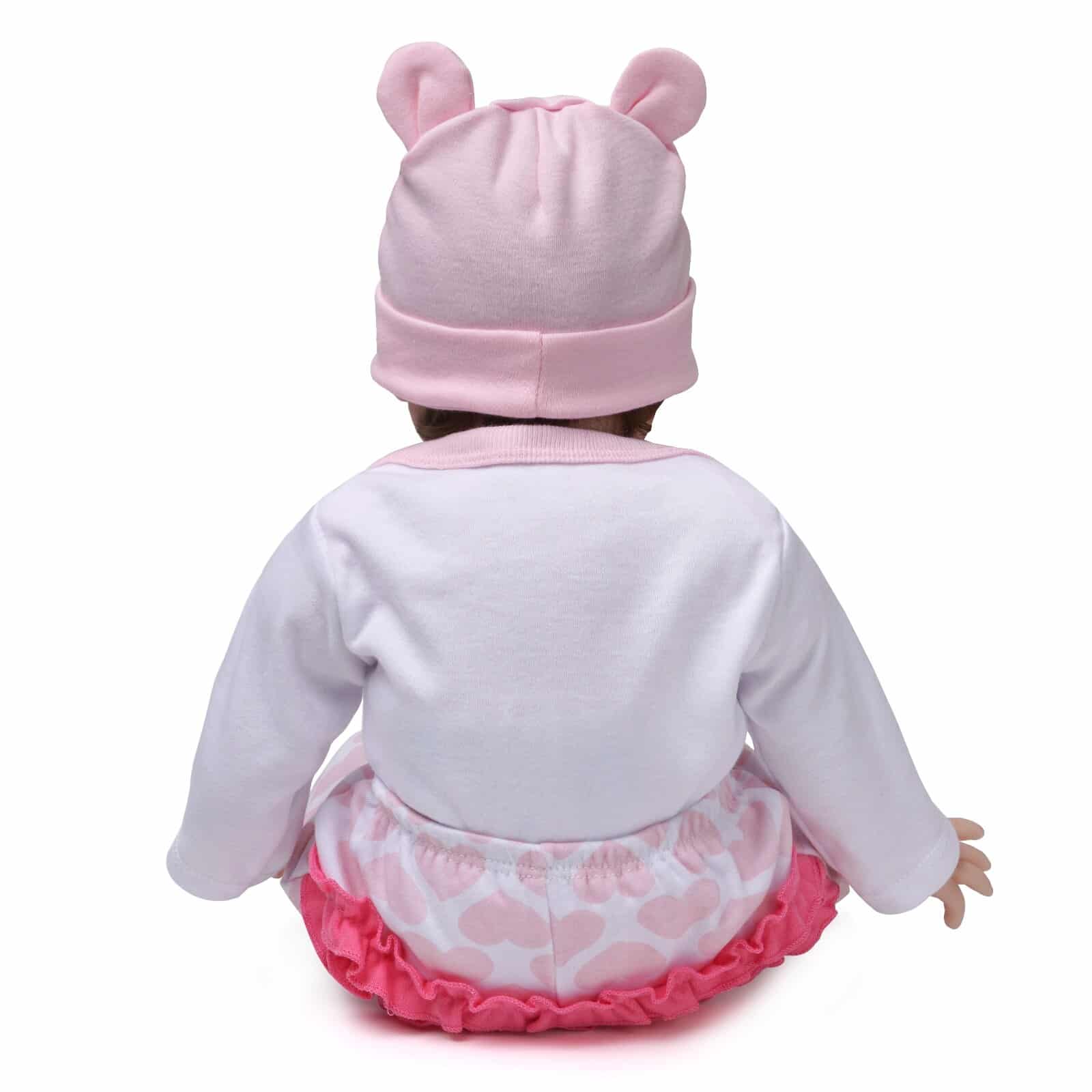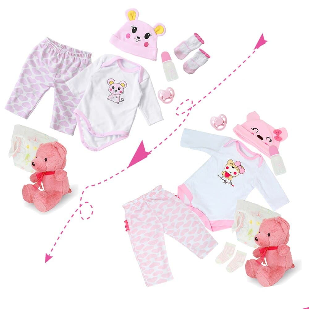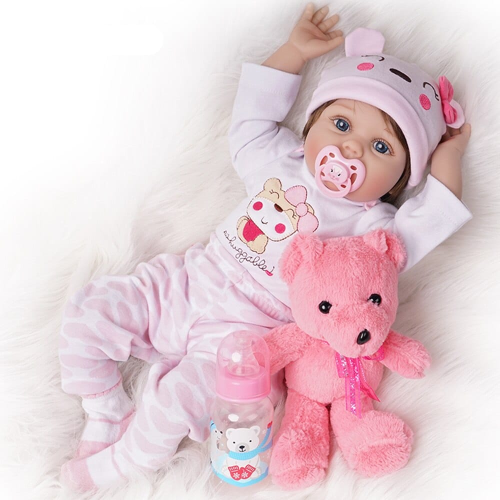 Ontdek onze meisjespop die een complete set siliconen en katoenen outfits bevat. Ze ziet er heel menselijk uit. De set bestaat uit een outfit, muts, magnetische fopspeen, zuigfles, beer en geboortecertificaat. De ledematen zijn flexibel, maar niet rekbaar, voor een betere interactie met de baby en haar handgemaakte haar.